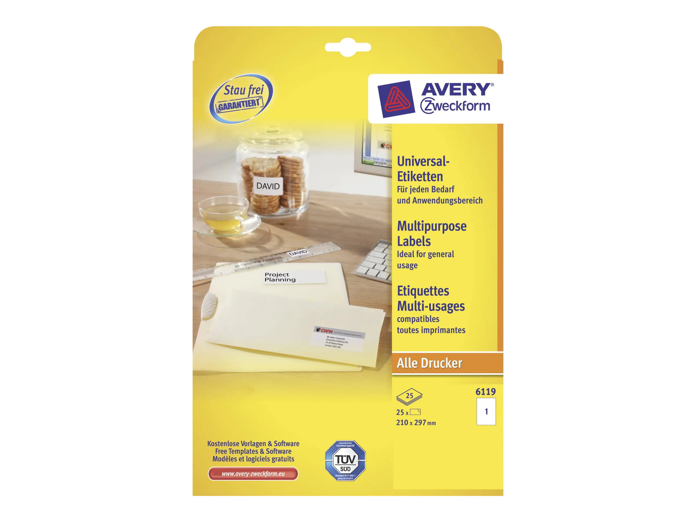 Die Universal-Etiketten von Avery Zweckform sind für alle gängigen Drucker und Kopierer geeignet und garantieren einen staufreien Druckerdurchlauf. Druckerdurchlauf für Laserdrucker getestet und bestätigt durch TÜV. Diese Aufkleber bieten Ihnen für jeden Bedarf und Anwendungsbereich die passende Lösung. Mit den Universal-Etiketten im Format 210 x 297 mm können Sie z.B. Sammelmappen beschriften. Dank der kostenlosen Avery Zweckform Vorlagen und Software-Lösungen können Sie die Universal-Etiketten schnell und einfach gestalten und drucken!