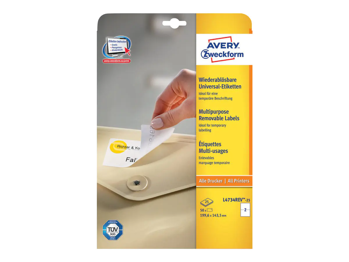 Die wiederablösbaren Universal-Etiketten von Avery Zweckform lassen sich mit allen gängigen Druckern und Kopierern bedrucken und garantieren einen staufreien Druckerdurchlauf. Diese Aufkleber bieten Ihnen für jeden Bedarf und Anwendungsbereich die passende Lösung und sind rückstandsfrei wiederablösbar. Kostenlose Software und Vorlagen finden Sie unter www.avery.eu/print.