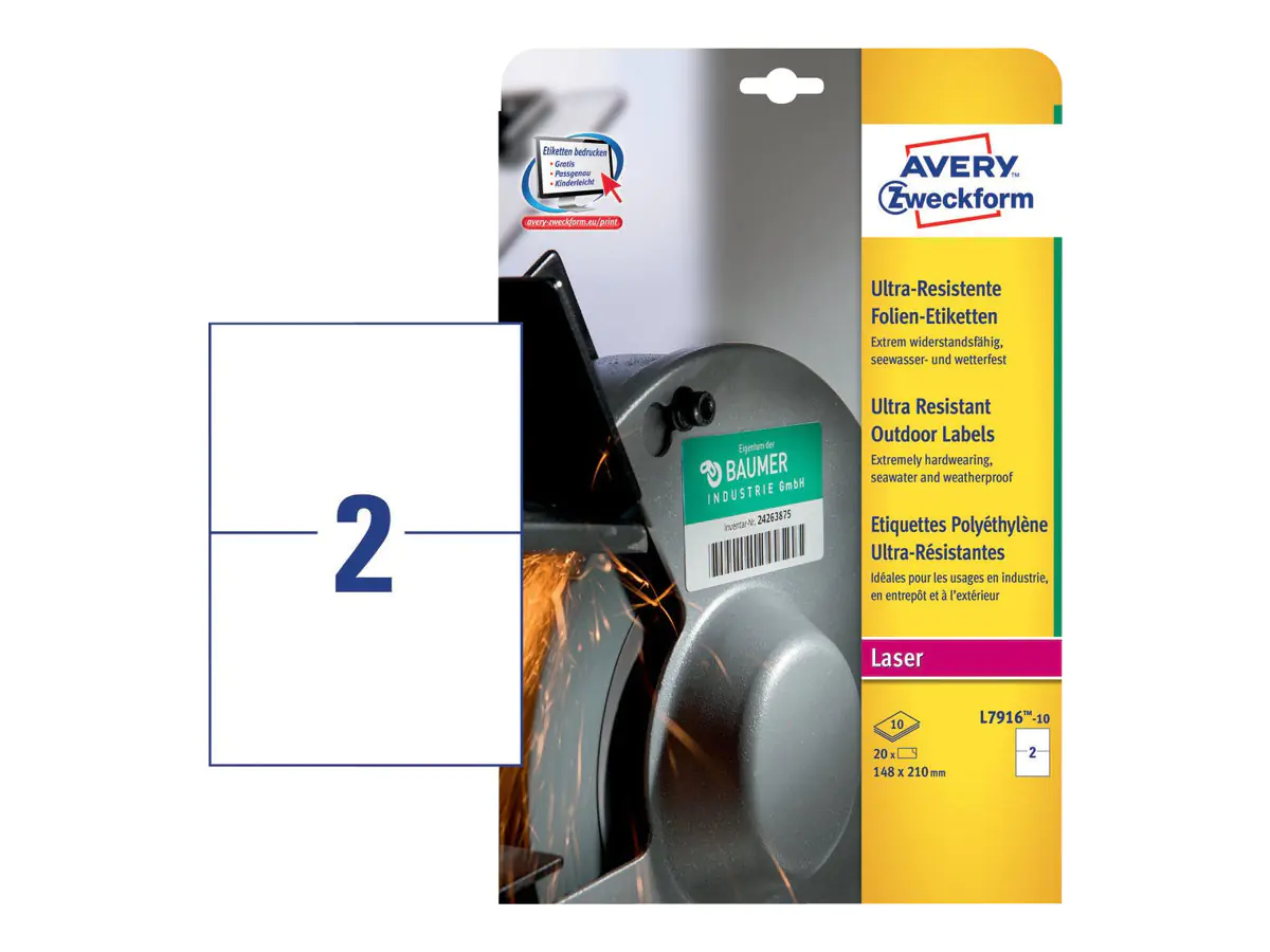 Die ultra-resistenten Folien-Etiketten von AVERY ZWECKFORM zeichnen sich durch eine hohe Strapazierfähigkeit für höchste Beanspruchungen im Innen- und Außenraum aus. Durch die Haftung auch auf schwierigen Oberflächen, eignen sie sich besonders zur Kennzeichnung in der Produktion und im Lager, zur Beschriftung von Containern oder zur Beschilderung. Die Folienetiketten sind ultra-widerstandsfähig. Zudem sind die Etiketten resistent gegen viele Lösungs- und Reinigungsmittel. Gestalten und drucken Sie Ihre Aufkleber schnell und einfach - mit den kostenlosen Avery Zweckform Etiketten Vorlagen und Software-Lösungen unter www.avery.eu/print oder den im Microsoft® Office Paket integrierten Basis-Vorlagen.