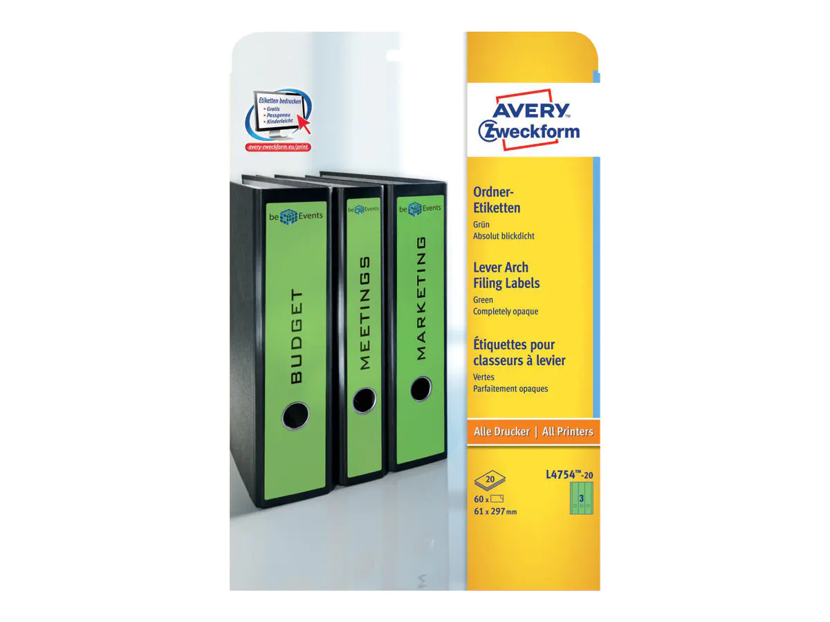Die einzigartige ultragrip-Technologie auf der Rückseite des Bogens garantiert präzisen Druckereinzug und staufreies Drucken. Halten Sie Ordnung in Ihren Unterlagen mit bedruckbaren Ordner-Etiketten. Durch das blickdichte Material können Sie alte Ordner erneut verwenden. Die alte Beschriftung scheint nicht durch. Die Rückenschilder lassen sich mit allen gängigen Druckern und Kopierern bedrucken. Gestalten und bedrucken Sie die Ordner-Etiketten mit unserer kostenlosen und benutzerfreundlichen Software.