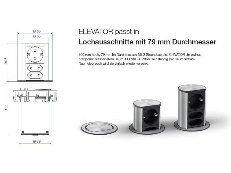 - Einbautiefe (ohne Kabel): 135 mm