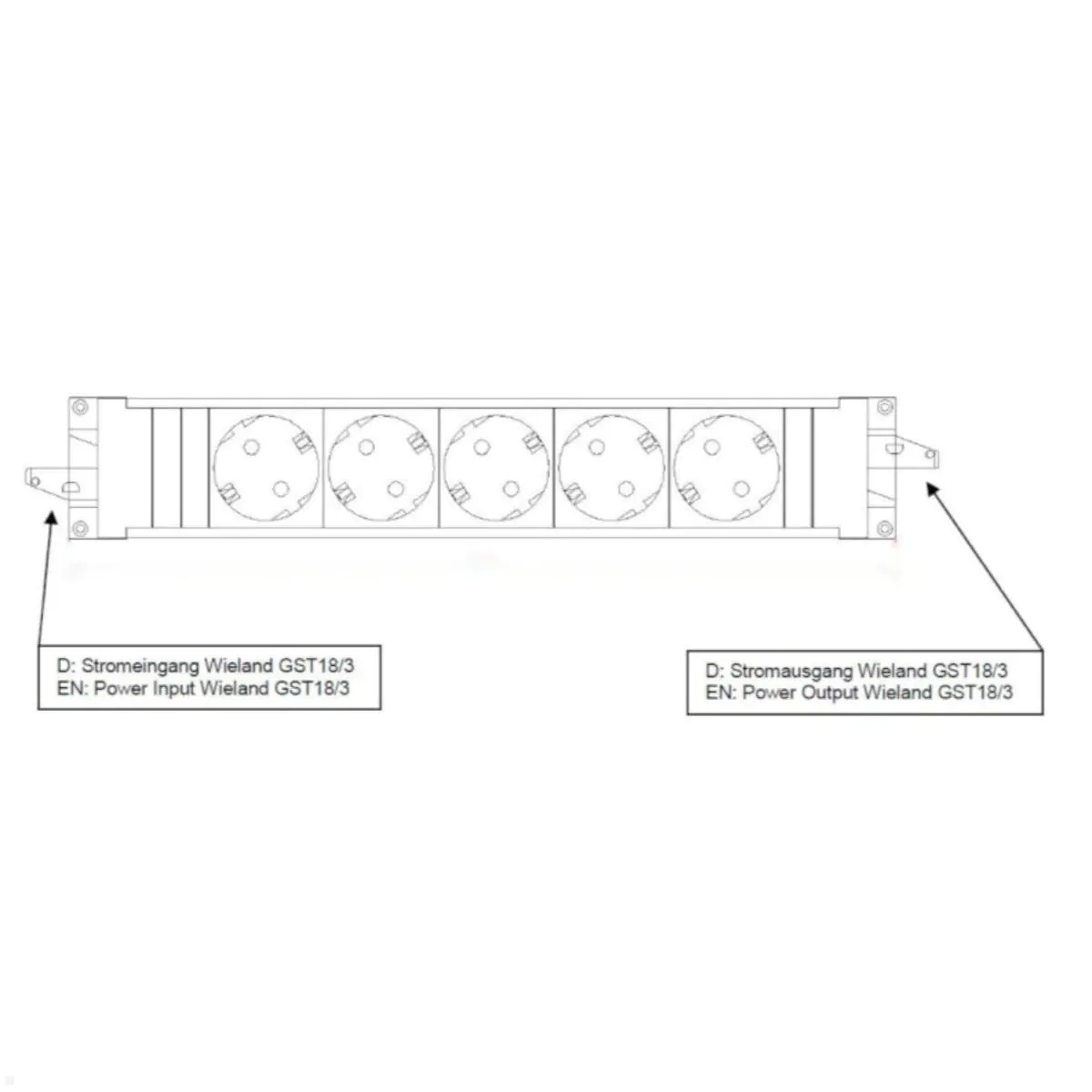 Für die Stromversorgung ist sie standardmäßig mit einem Wieland GST18i3 Stecker und einer GST18i3 Kupplung ausgestattet. Die Gerätezuleitung kann separat erworben werden, um verschiedene Leitungseingänge zu ermöglichen. Die Mehrfachsteckdose hat 5 Schutzkontaktsteckdosen und der zentraleinsatz der Leiste ist um 35 Grad gedreht, damit das Einstecken von breiten Steckern erleichtert wird. An der Steckdosen Leiste können permanent aufgestellte Geräte wie PC, Monitor, Drucker usw. angeschlossen werden.