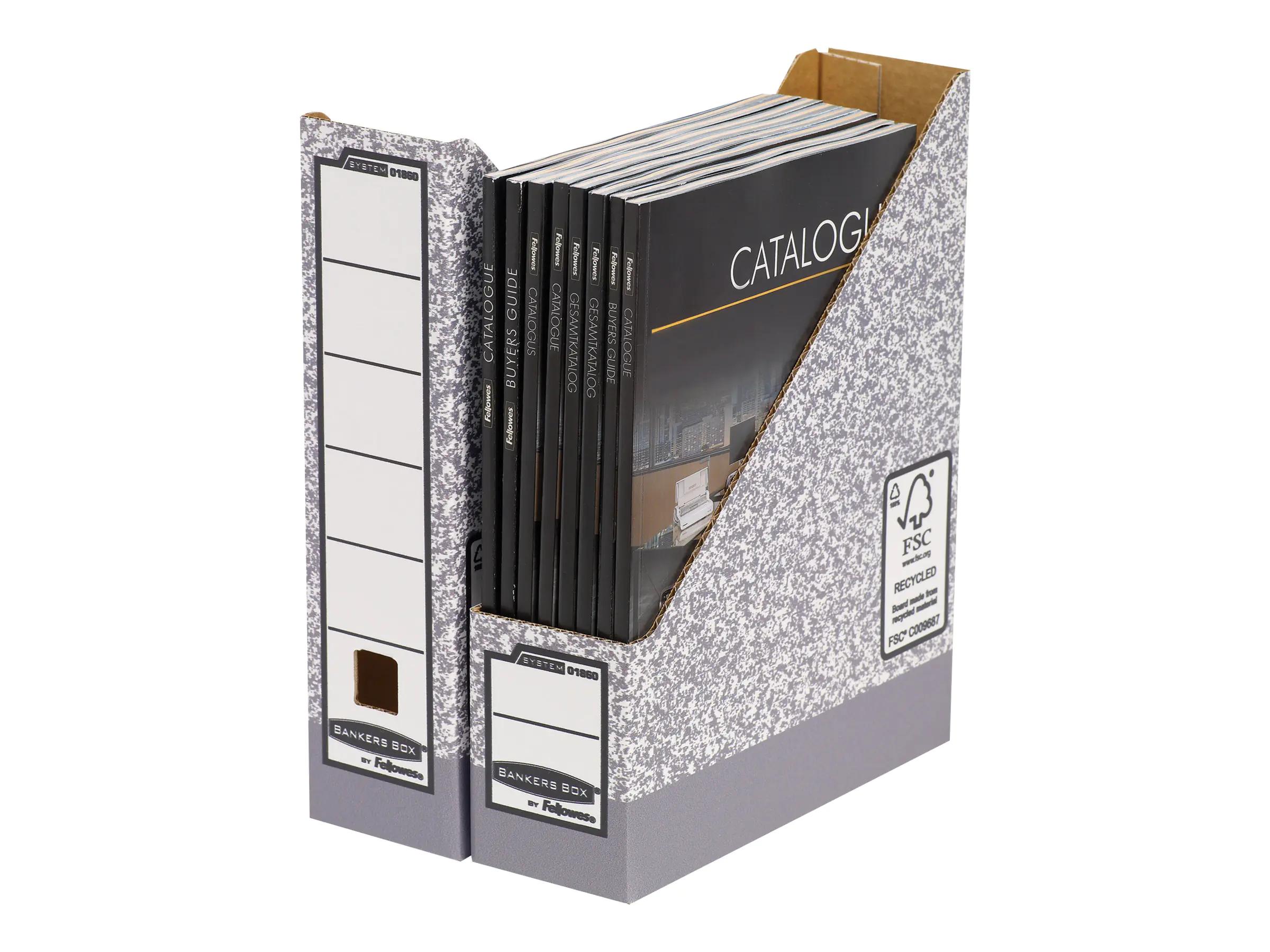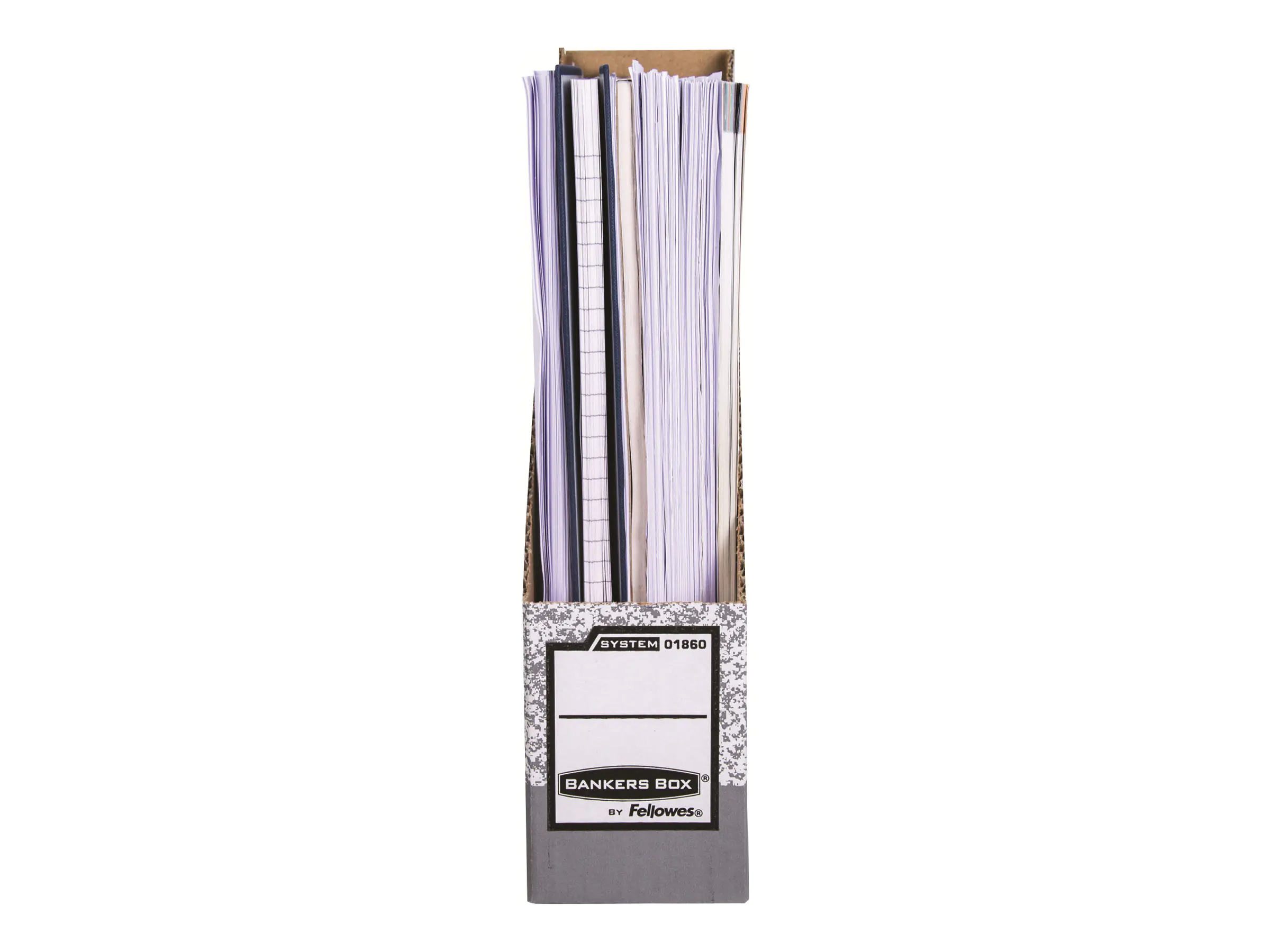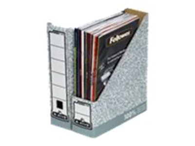 Magazinarchiv Bankers Box System. Vorderer und hinterer Schilderbereich, zur Aufstellung mit offener Vorder- oder geschlossener Rückseite.