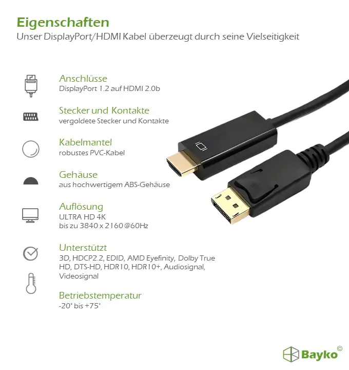 Entdecken Sie die ultimative Verbindung mit dem Bayko PERFORMANCE DisplayPort 1.2/HDMI 2.0 Anschlusskabel.