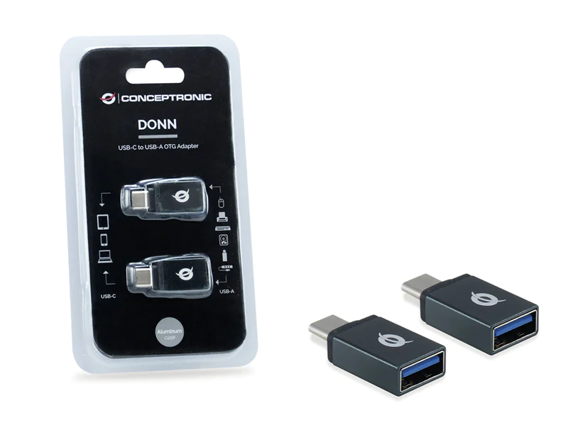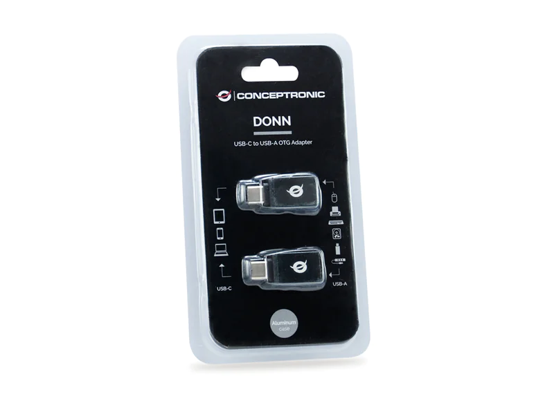 Conceptronic DONN OTG-Adapter für USB-C zu USB-A 2er Pack. Anschluss 1: USB 3.1 Gen 1 Type-C, Anschluss 2: USB 3.1 Gen 1 Type-A. Produktfarbe: Schwarz