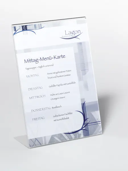 Aufsteller zur Verwendung an Verkaufstheken, Rezeptionen etc. Einseitig verwendbar. Standfest durch selbstklebende Gummifüße. Schnelles und einfaches Auswechseln von Informationen durch seitliche Entnahme.