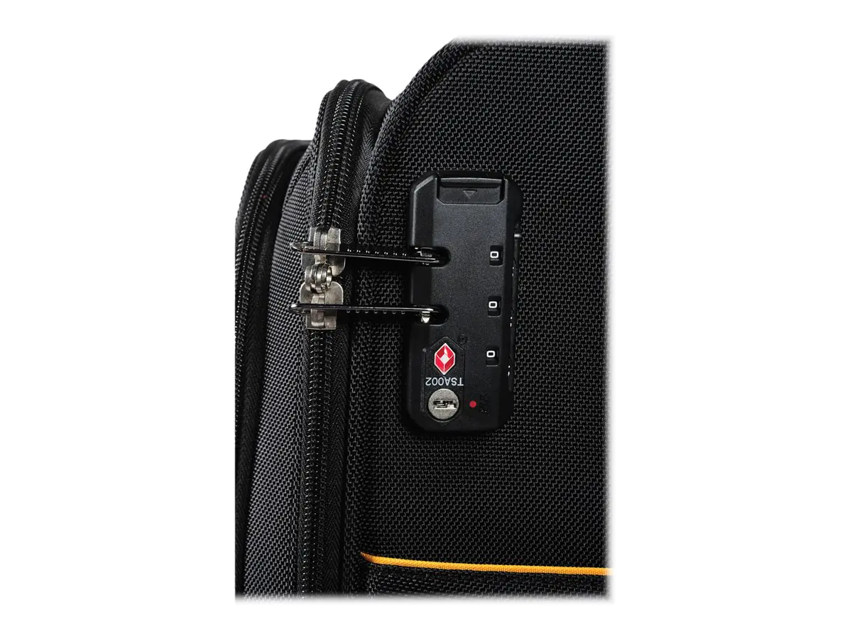 - seperat gepolsterte Taschen für Laptop und Notebook, integriertes TSA-Hängeschloss, zwei integrierte USB-Anschlüsse, ein integrierter Mikro-USB-Anschluss, Kabel, Kreuzbandgurt