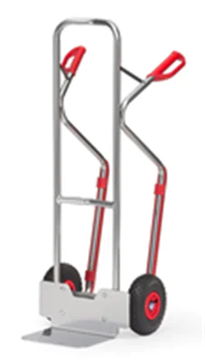 Aus Aluminiumrohr mit Aluminiumschaufel, sehr leicht und handlich. Stabile Schweißkonstruktion. Sicherheitsgriffe. Schaufel anschraubbar und dadurch austauschbar. Räder mit Luftbereifung auf Kunststoff-Felgen, Naben mit Rollenlagerung. Bügel oben und Querstreben durchgebogen. Für den sicheren Transport von Gütern, wie Rollen, Kannen, Eimern usw.