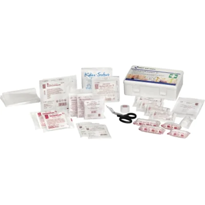 Der weiße First Aid Only Verbandkasten C eignet sich daher für Betriebe und Baustellen gemäß Arbeitsstätten-Richtlinien. Die Inhalte entsprechen somit den darin vorgeschriebenen Verbandstoffen und Erste-Hilfe-Materialien: Neben einer Heftpflasterspule sind verschiedene Verbände, Kompressen, Binden, Tücher und Pflaster sowie eine Rettungsdecke in gold/silber, eine Erste-Hilfe-Schere und Einmalhandschuhe enthalten. Beiliegend sind auch eine Erste-Hilfe-Broschüre und ein Inhaltsverzeichnis.