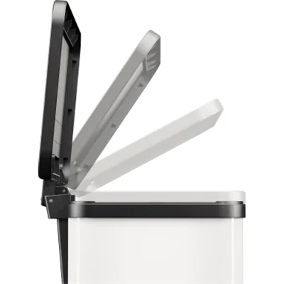Der Tret-Mülltrenner mit drei einzeln entnehmbaren Inneneimern. Gedämpfter Deckel-Schließ-Mechanismus (Soft close). Ergonomisch breites Fußpedal aus Kunststoff. Innenliegende Tretmechanik. Inkl. Farbsticker zur Müllsorten-Kennzeichnung.