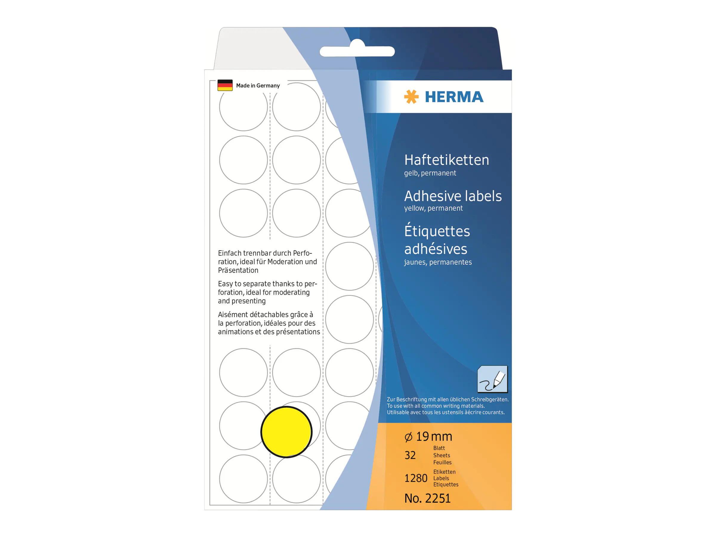 | Beschreibung | HERMA Papier - matt - permanenter Klebstoff - Gelb - 19 mm rund 1280 Etikett(en) (32 Bogen x 40) Etiketten | |||