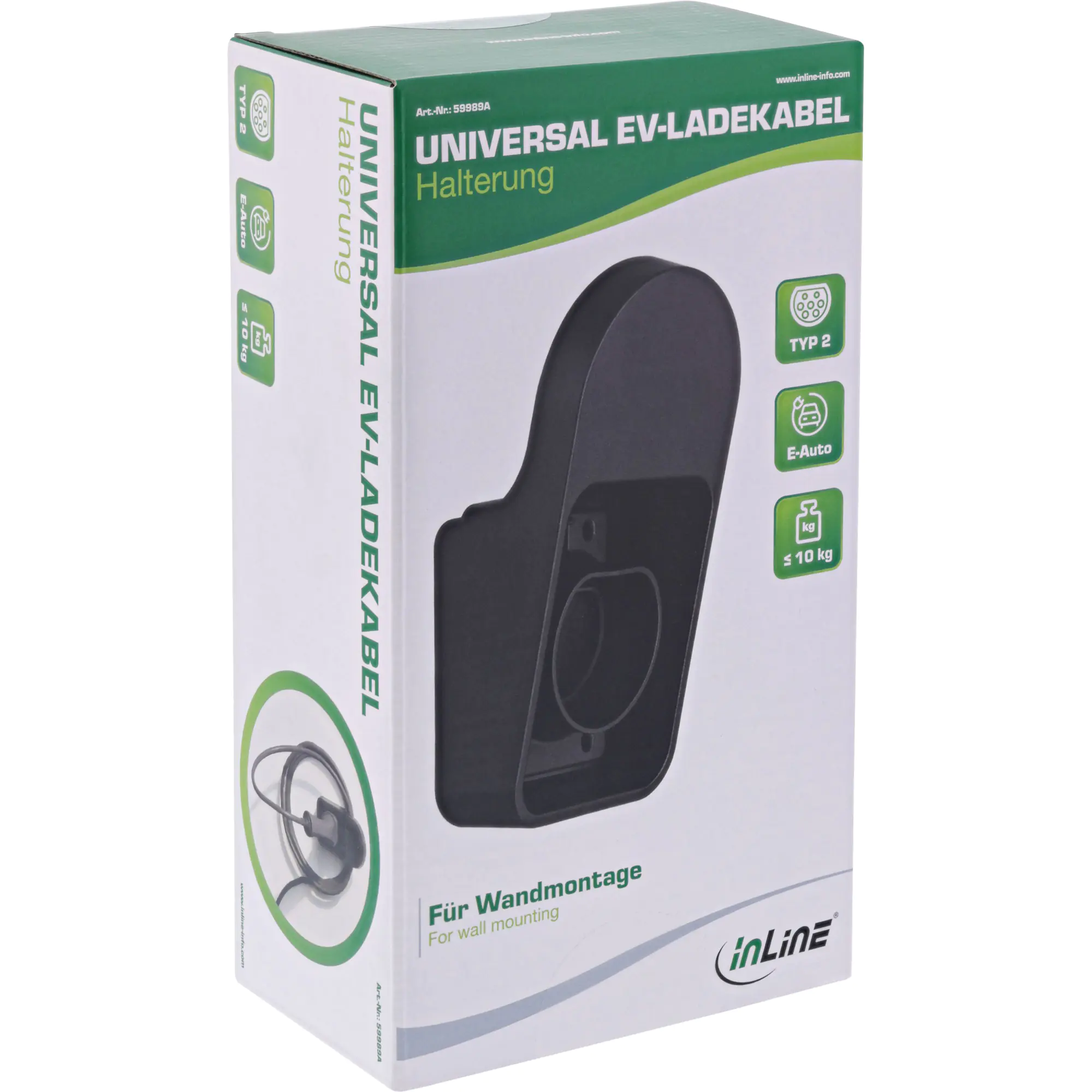 Diese Universal EV-Ladekabel Halterung von InLine ist die perfekte Lösung für die ordentliche und praktische Aufbewahrung Ihres Typ 2 E-Auto-Ladekabels (IEC 62196). Die Montage an der Haus- oder Garagenwand ist dank der beiliegenden Dübel und Schrauben schnell und unkompliziert erledigt. Durch die Halterung ist das EV-Ladekabel immer griffbereit an der Wand und schützt die Kabelkupplung vor Beschädigungen durch Überfahren.