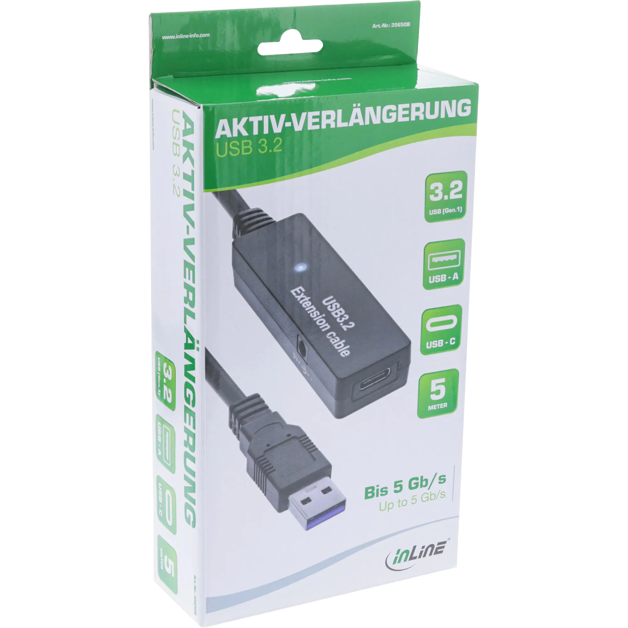 Das leistungsstarke aktive USB 3.2 Gen.1 Verlängerungskabel von InLine ist die ideale Lösung, um USB-Ports von unzugänglichen Stellen an die gewünschte Position zu verlegen. Dabei können durch die integrierte Elektronik lange Distanzen von bis zu 15 Metern verlust- und störungsfrei überbrückt werden. Die USB-Verlängerung findet Anwendung bei Festplatten, Drucker, Webcams, Headsets, Mäusen, Tastaturen und anderen USB-Geräten. Die Datentransferrate von bis zu 5 Gb/s ermöglicht Ihnen eine blitzschnelle und zuverlässige Datenübertragung. Für Verlängerungen ab 10 Metern und länger empfehlen wir die Verwendung des mitgelieferten Steckernetzteils.