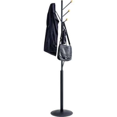 Die junge, moderne Standgarderobe aus Stahl. Drei gerade plus ein elliptisch verlaufender Haken. Geringer Durchmesser auch für kleine Räume. Abgerundete Holzköpfe schonen die Kleidung. Besonders geeignet für den privaten Gebrauch oder als Zweitgarderobe. Metallhaken mit Endstücken aus Holz (Ø: 3,3 cm), fest verklebt. Fuß in gewölbter Form sorgt für einen sicheren Stand. Schnelle und leichte Montage.