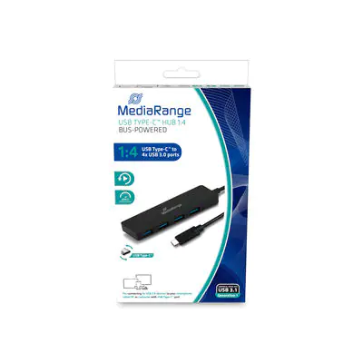 MediaRange MRCS508. Hostschnittstelle: USB 3.2 Gen 1 (3.1 Gen 1) Type-C, Hub-Schnittstellen: USB 3.2 Gen 1 (3.1 Gen 1) Type-A. Datenübertragungsrate: 5000 Mbit/s, Produktfarbe: Schwarz, Kabellänge: 0,1 m. Ausgangsspannung: 5 V, Ausgangsstrom: 0,9 A. Breite: 99 mm, Tiefe: 31 mm, Höhe: 9 mm