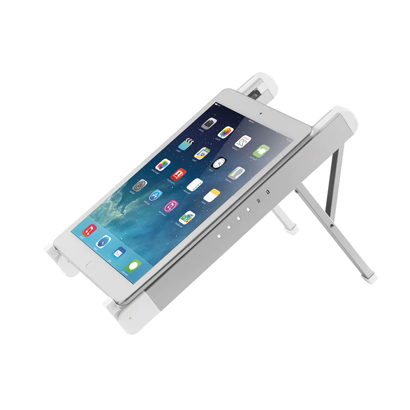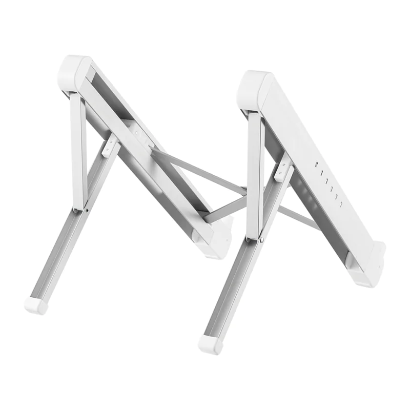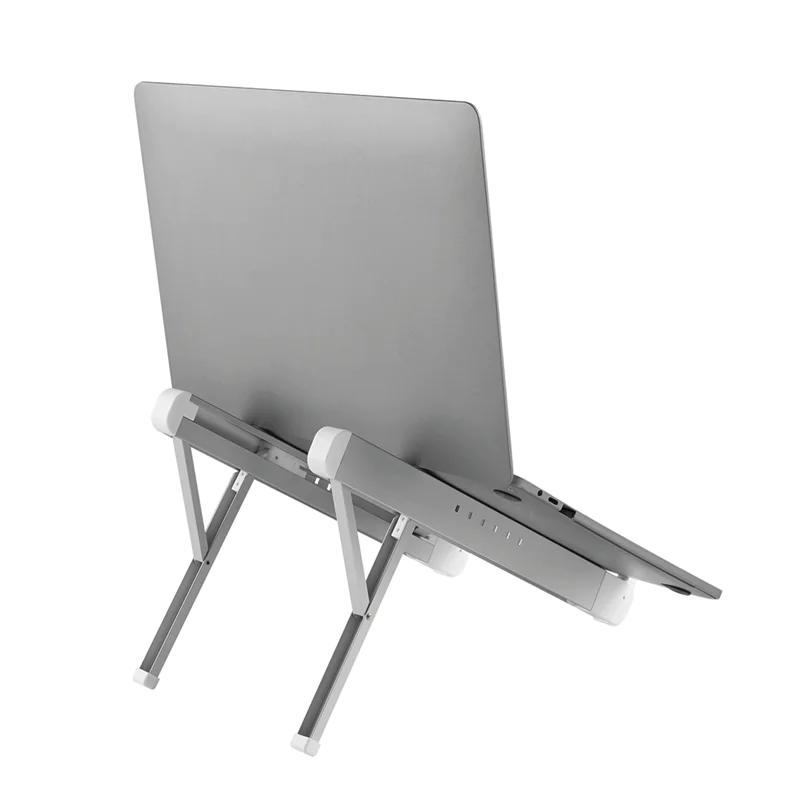 Durch das leichte, kompakte Design eignet der Ständer sich ideal, um ihn überall hin mitzunehmen. Die offene Konfiguration sorgt für eine gute Belüftung des Laptops und die rutschfesten Silikonkissen sowie die Sicherheits-Leisten sorgen für eine solide Positionierung.