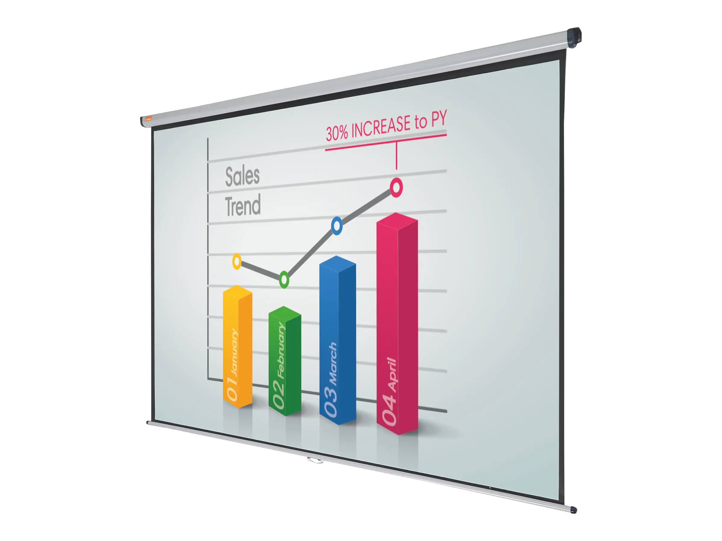 Die brillante mattweiße Oberfläche dieser Leinwand gewährleistet scharfe und detailreiche Bilder, die für alle Anwesenden klar erkennbar sind. Die Leinwand kann zum Schutz vor Beschädigung oder bei Nichtgebrauch ins Gehäuse eingezogen werden. Mit den optionalen Auslegern lässt sich die Leinwand über einem Whiteboard anbringen oder zu den Anwesenden neigen. Projektionsfläche 150 x 104 cm.