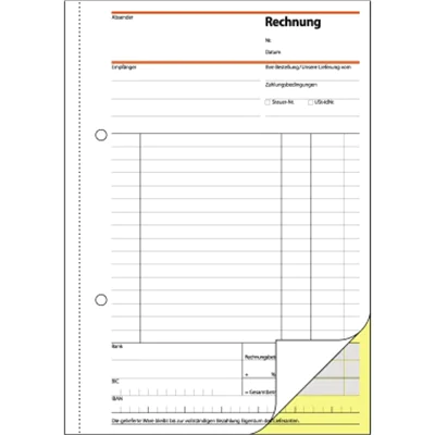 Mit allen erforderlichen Angaben wie z.B. IBAN/BIC, Steuernummer/USt-IdNr. und Rechnungsnummer. Eine Sicherheitsbindung macht das Formularbuch besonders stabil und haltbar.