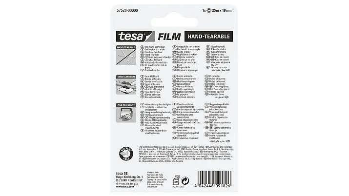 tesafilm® von Hand einreißbar ist das selbstklebende Klebeband für eine schnelle und einfache Anwendung. Er verfügt über spezielle, leicht reißbare Kanten, die ein bequemes Reißen von Hand auch ohne Spender ermöglichen.
