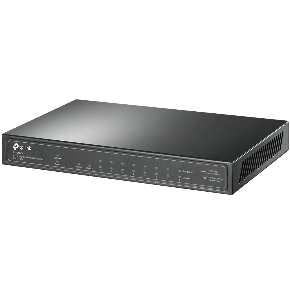 TP-Link TL-SG1210P - Switch - unmanaged - 8 x 10/100/1000 (PoE+) + 1 x 10/100/1000 (Uplink) + 1 x Gigabit SFP (Uplink) - Desktop - PoE+ (63 W)