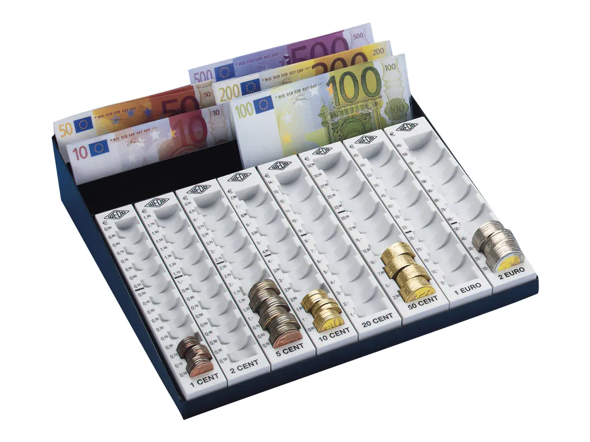 WEDO Hartgeld-Zählbrett mit 8 einzeln herausnehmbarer Münzrillen. Metallrahmen mit 3 Scheinfächern zur Aufnahme der Geldscheine. Unentbehrlich für alle, die viel mit Münzgeld zu tun haben. Die Münzräume gewährleisten einen leicht abzulesenden Kassenbestand und halten Ordnung in der Schublade. Vier Gummifüße sorgen für einen rutschfesten Stand.
